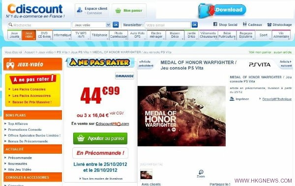 法國電商CDiscount今天開始在其官網開始PS Vita版《Medal of Honor: Warfighter》預定。