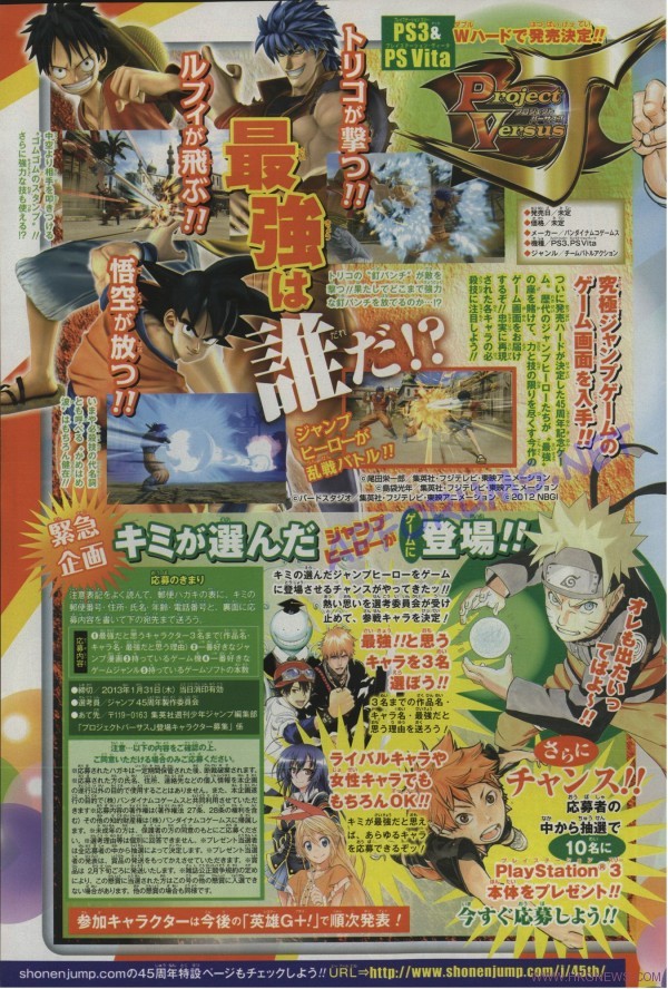 之前由2CH網友透露的消息現在已確認了。代號為《Project Versus J》的這款遊戲將登陸PSV與PS3平台,類型為組隊格鬥。同時最新的JUMP雜誌圖還率先公開了本作的遊戲畫面。此外目前官方還舉辦一項活動,由你來投票決定在本作中登場的英雄,火影死神還是最強會長黑神呢?