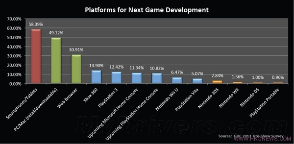 開發興趣方面,任天堂同樣很慘,Wii U、3DS分別只吸引了12.58%、5.55%的開發人員,分列倒數第三、第一。微軟和索尼的新主機較量中,微軟暫時取得上風,逼近了30%,高出兩個多百分點。