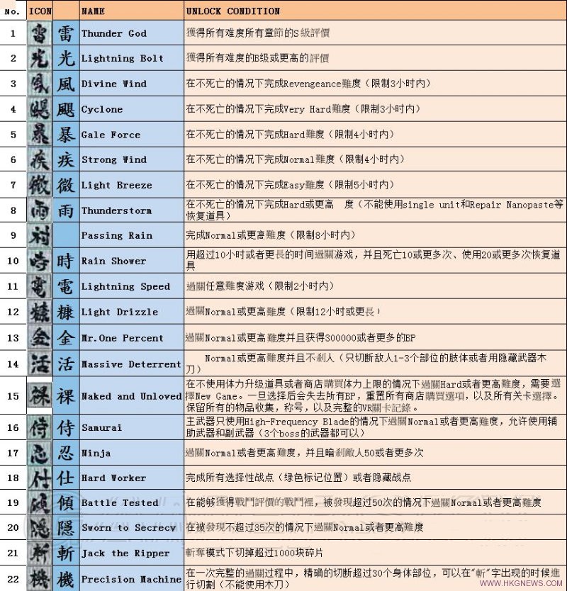 8.Revengeance難度,不死亡全S評價3小時內通關(最難的……請每個戰鬥節點做好存檔備份)。