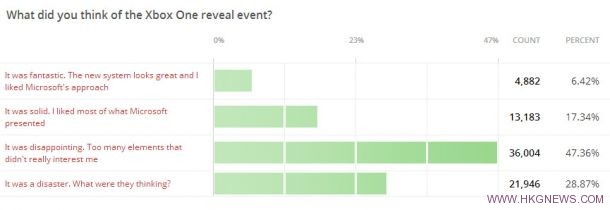 具體的投票內容如下:“你對Xbox One的公佈會有何看法?”大約25%的人對公佈會表示了支持的態度,其中6%的人說“大會很好很強大!”17%的人認為“大會內容很充實。”同時,76000人中超過75%的人,也就是將近57000人對此表示了不滿。其中47%的人(近一半)表示“對公佈會中展示的大部分內容不感興趣,”而另外29%的人表示公佈會“就是一場災難。”