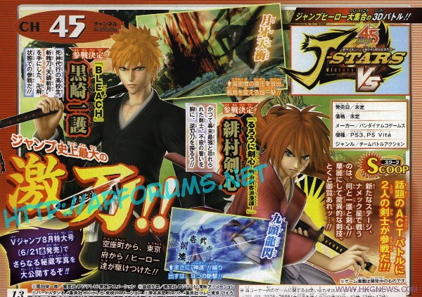 日本周刊少年Jump45週年慶的作品,NBGI打造,定名為《Jump全明星亂鬥 / J-STARS Victory VS》的3D格鬥新作日前曝光最新圖片,除了初次公佈的路飛,鳴人,悟空,阿虜,“Bleach”的黑崎一護,“浪客劍心”的緋村劍心正式加入!本作登陸平台為PS3和PSV,同時很有可能支持Corss Play,該作將集結Jump歷年來的知名角色,打造一個亂炖式的亂鬥動作遊戲。