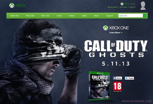 同時,頁面上部的Xbox One商標則很自然的讓人與微軟新一代遊戲機的上市時間聯繫在一起,由於在之前的發布會上微軟和動視已經證實《Call Of Duty : Ghost》將作為Xbox One的首發遊戲亮相,因此11月5日的發售時間或許也同樣適用於遊戲機本身。