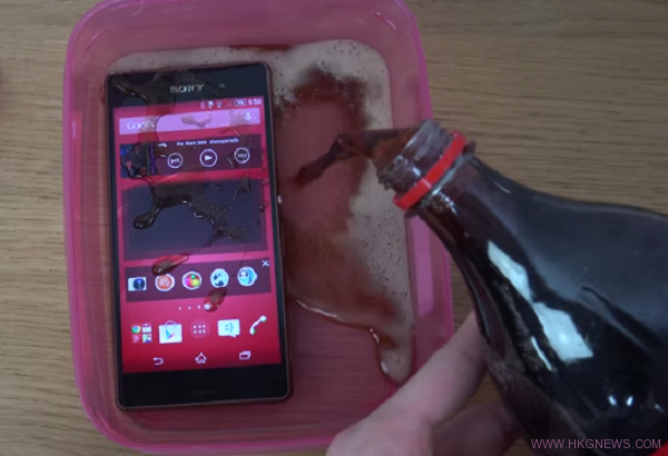 一款防水性能佳的手機會給用戶帶來更多環境下使用的可能,但下面的事情還是請勿隨意模仿。有網友將一部Sony Xperia Z3浸泡在了可口可樂中,不過他還沒滿足。