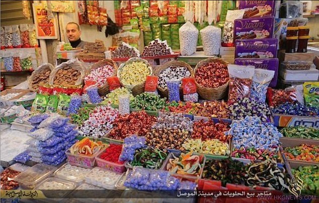 琳瑯滿目:照片拍攝於ISIS伊拉克政權基地摩蘇爾,旅行宣傳冊風格的照片向人們展示了擁擠的市場裡攤位上的橄欖、醃菜和各式糖果。
