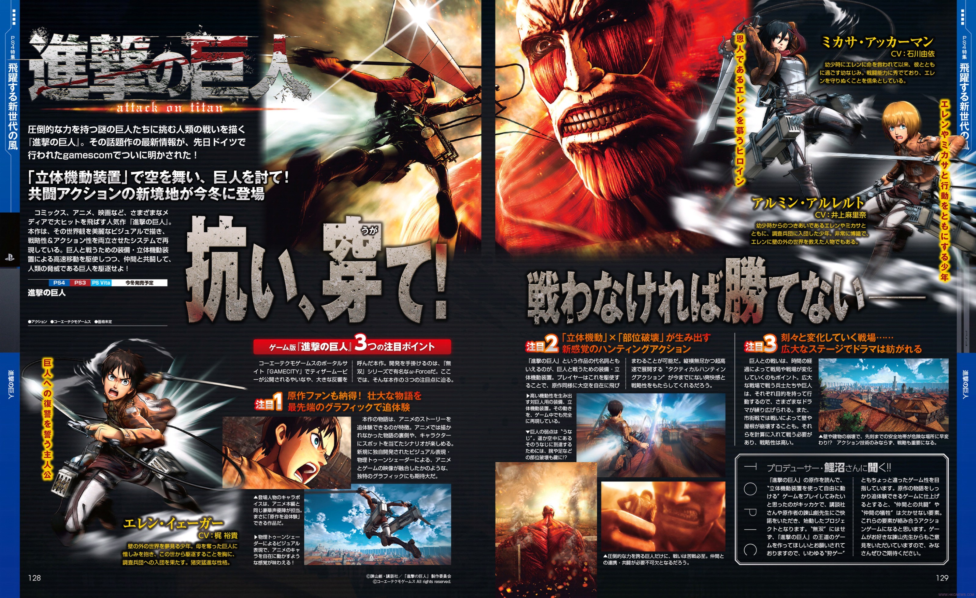目前本作開發進度為50%,可操作角色除了艾倫之外,三笠·阿克曼與阿爾敏·亞魯雷特也確認參戰。收錄動漫精彩過場,引入《Final Fantasy》物理破壞機能。