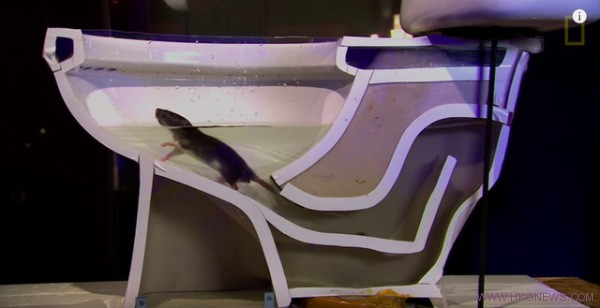 實驗者設計了一個半透明的馬桶,讓我們可以從剖面清楚觀察到老鼠如何在水管移動。一開始,老鼠就從馬桶底部很順利的爬上管道,不過隨即在彎道的地方停了下來。