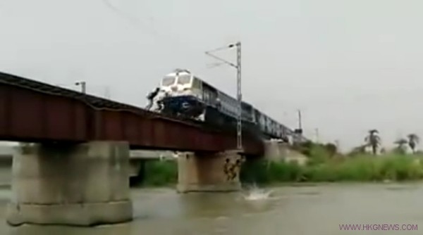 印度北方省一群約10到15歲小孩們,日前,在一高架鐵軌上,玩跳河遊戲。等火車高速疾駛經過他們所站立的地方後,小孩們才一一跳入河中,且樂此不疲,讓人替他們捏一把冷汗。
