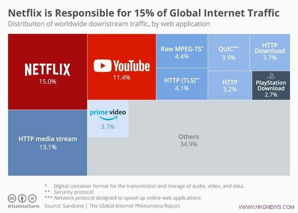 數據網站Statista根據Sandvine的報告製作了一張圖表,本圖非常直觀地體現出了全球流量佔比,可以看到僅網飛一家就佔了全球下行流量的15%,Youtube緊隨其後,佔比達到了11.4%。