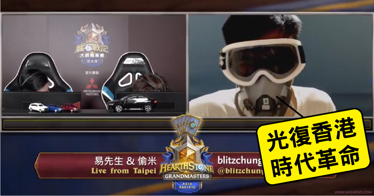 遊戲「爐石戰記」(Hearthstone)上周日舉行亞太區大師職業賽,人稱「聰哥」的香港選手Blitzchung 在賽後訪問中,戴著防毒面罩高呼「光復香港」,美國遊戲商暴雪娛樂(Blizzard Entertainment)今日發出聲明,指 Blitzchung 違反賽規,將取消其賽事資格及獎金。
