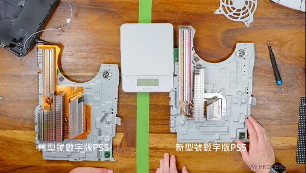 這款新型號的數字版PS5 在重量上,Austin Evans將主機拆開以後,將散熱器拆出來拿去跟舊型號的進行比對,也能夠看出
