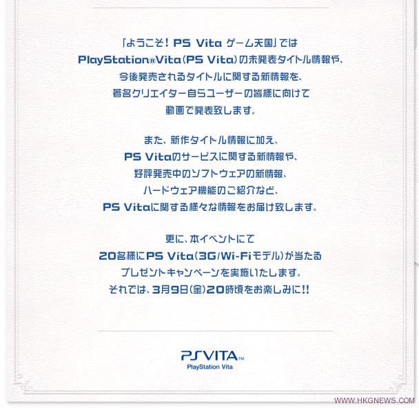 Sony今日公佈將於2012年3月9日晚上7點(20:00)召開PSVita發布會,而本次的主題也打出了“歡迎來到!PSVita的遊戲天國”,到時Sony將會公佈PSVita已經公佈的遊戲情報和一些即將登陸PSVita的神秘新遊戲。而現場也將推出抽獎活動可獲得PSVita(3G/Wifi)共20名。