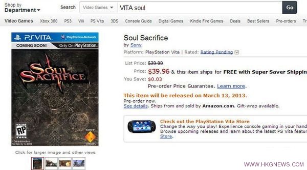 由著名遊戲製作人稻船敬二打造的ARPG《Soul Sacrifice 》將會登陸PSVita平台。日前,亞馬遜網購站點的相關頁面上顯示,本作的北美髮售日為2013年3月13日。