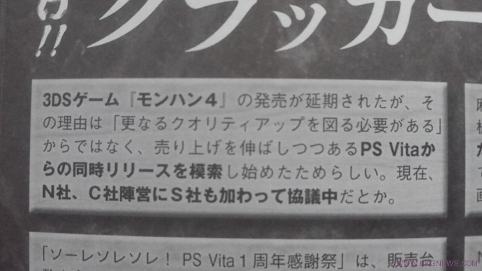 《魔物獵人4》延期發售是因為有同時發售PSV版的可能,並稱SONY已經在與任天堂和CAPCOM協議當中。雖然只是該雜誌一家之言,不過該雜誌曾在《God Eater 2》宣布延期之後預言該作跨PSV平台成真。因此有部分日本玩家表示可以再信他一回。