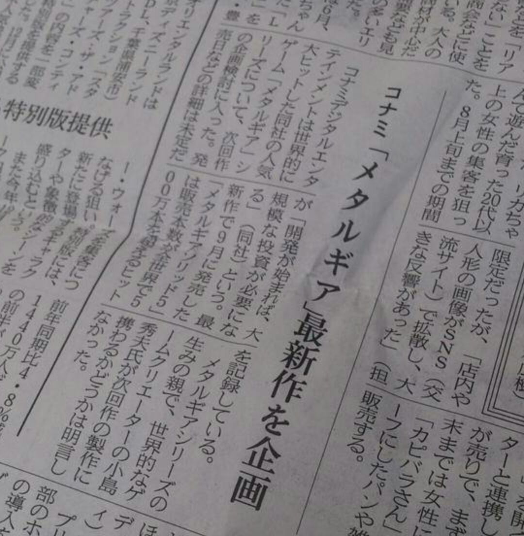 日本經濟新聞報11月2日報導,Konami正在討論《Metal Gear Solid 》最新作的企劃。